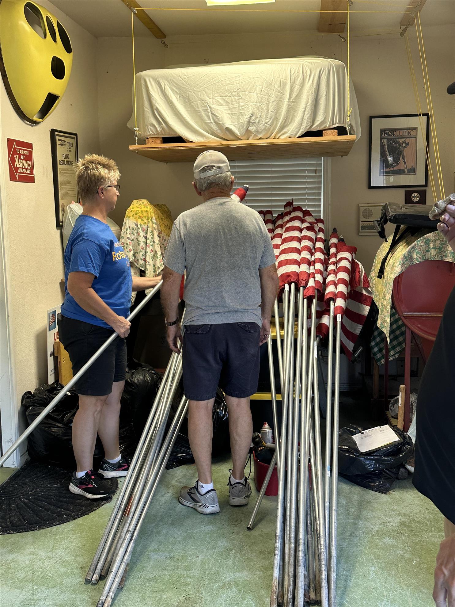 Flags needing repair or retirement loaded on trailer for Craig's garage and work party later this week.