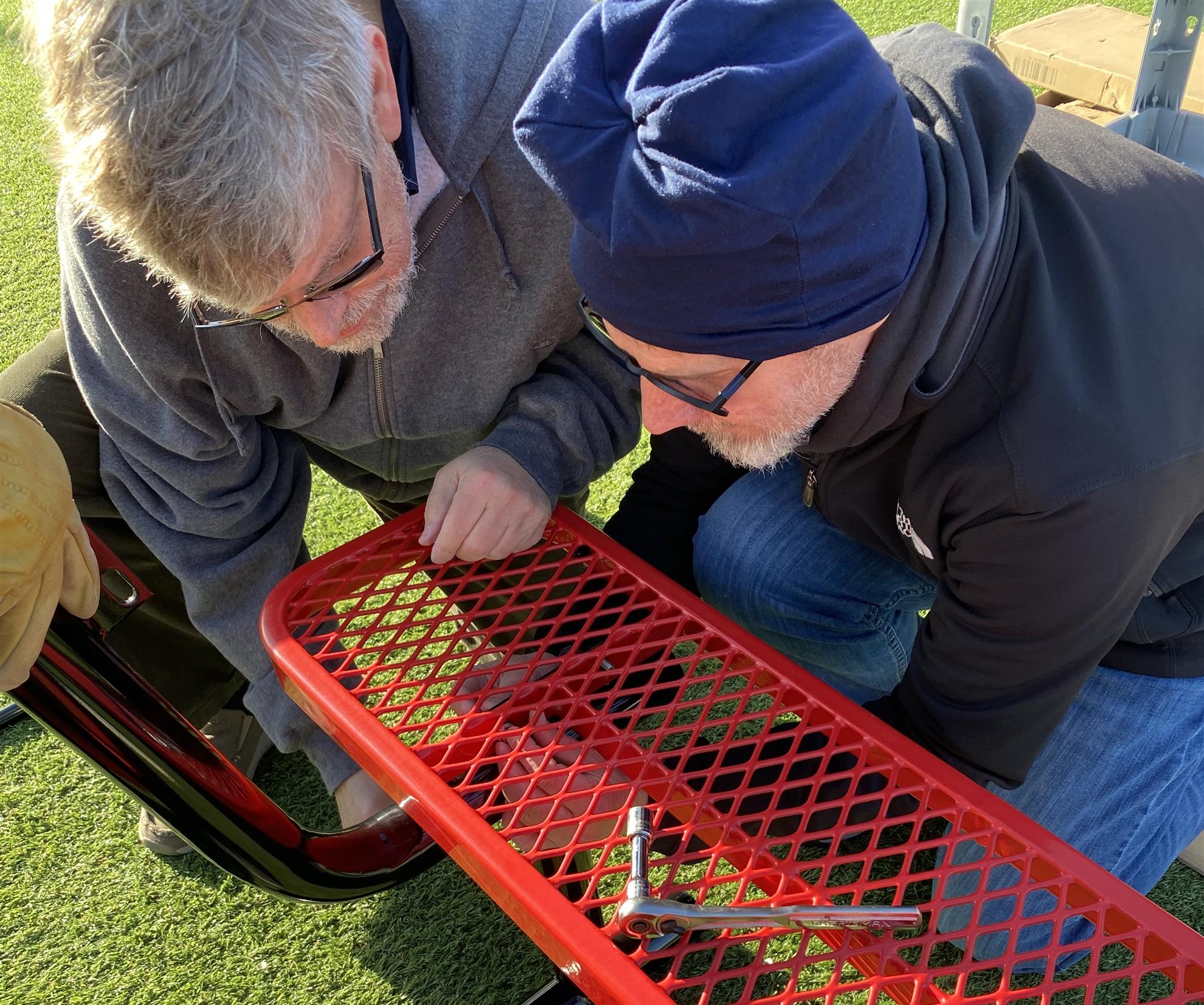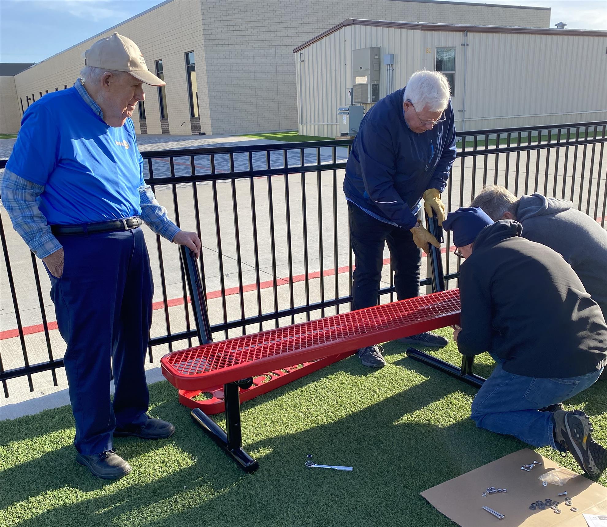 Ken Truax, Dennis Newman, Brian Kirkpatrick, Bob Wales, and Erik Stokes built a sturdy bench at Highland Elementary with no extra parts left over.